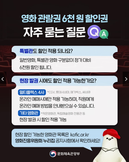 - 해당 영화관 방문 후, 매표소에서 “6천 원 국민영화관람 할인권” 신청 의사만 밝히면 선착순으로 할인 적용(회원가입 불필요).
